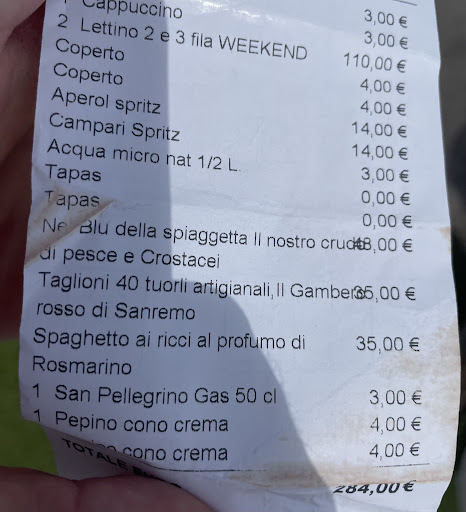 Read moreI have been coming here for a few years and is absolutely one of my favourite places on earth. The owners are lovely. It’s stunning, the service is wonderful, food is great, beach access is easy. Why the 3 stars? I knew it’s not a cheap place but recently paid almost €300 for a day for two people. I was shocked and speechless. We didn’t go crazy, had an easy pasta lunch with some raw fish starters and a gelato in the afternoon. No bottle service, no extravagance. And most of all, you’re still in Ventimiglia and not in St Tropez. It’s definitely a premium experience when you compare with the other beaches of Menton but come on! I don’t want to leave a bad review but definitely recommend being a bit more realistic. After this experience I probably won’t return until I make the BIG bucks and would encourage others to vote with their feet and utilise the public portion of the beach which is accessible to us commoners (which this bill definitely confirmed, I am...