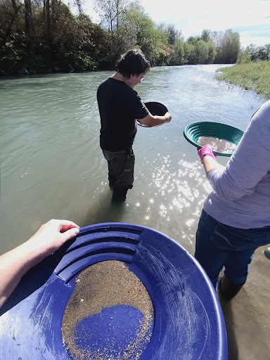 Arrivati al fiume, Paolo ci ha insegnato a cercare l'oro, setacciando il greto in un'attività che man mano è diventata una meditazione. Ma che emozione quando abbiamo visto la prima pagliuzza d'oro sul fondo di una batea! E quante risate!
