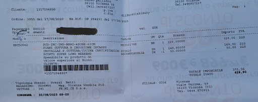 Read moreHo ordinato un piano induzione con costo di istallazione di 149. Euro. Nessuno mi.ha informata che per questo tipo di apparecchio ci vuole una istallazione dedicata e conseguentemente un intervento dell'elettricista per PREdisporre L'ISTALLAZIONE.