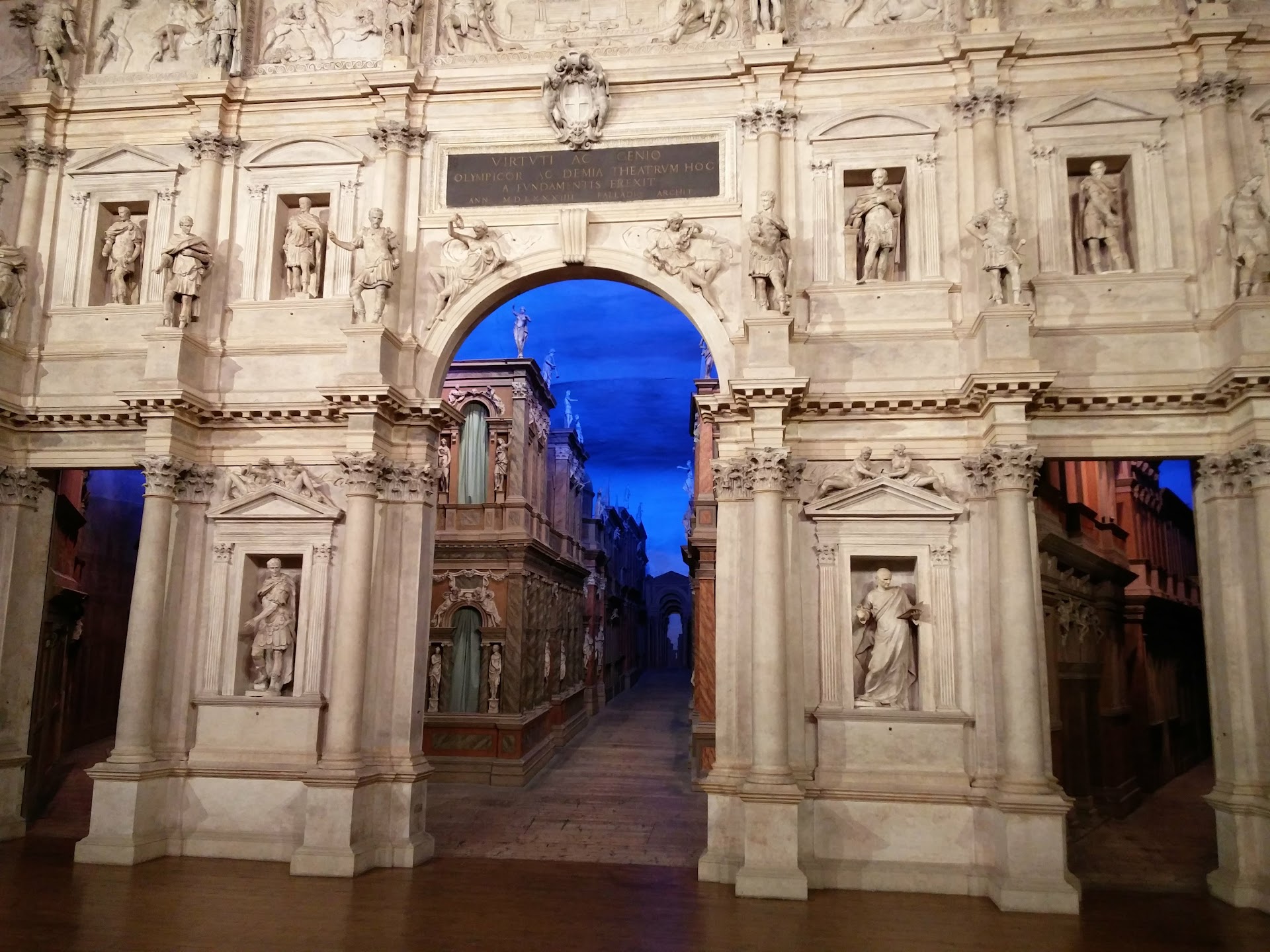 Imbattersi in Vicenza - splendido gioiello del Veneto - vuol dire soprattutto Andrea Palladio. Ogni angolo, ogni ogni elemento architettonico di questa splendida cittadina porta sue tracce indelebili, plasmate dal genio artistico tardo rinascimentale quale è stato. L'apoteosi potrebbe racchiudersi nel progetto e realizzazione del teatro Olimpico, ma sarebbe riduttivo limitare lo sguardo solo ad esso se si considerano gli innumerevoli capolavori in linea con il modello antico "classicizzante" secondo lo stile scelto e prediletto che ci ha lasciato, seppur con slanci creativi "moderni", tanto da influenzare artisti ma soprattutto le epoche a venire sino ai giorni nostri. (La Casa Bianca ne è un esempio). È paradossale pensare che, proprio per il teatro Olimpico il Palladio abbia dedicato 40 anni di intensi studi, disegni, rilievi, rielaborazioni, modifiche, e dopo solo sei mesi dalla esecuzione dei lavori, a causa dell'improvviso decesso, non sia riuscito a realizzare il sogno, tanto bramato, di contemplare la sua opera magna. Va detto che furono gli Accademici Olimpici (un gruppo nobiliare di privati e cui uno dei soci fondatori era proprio il Palladio) a patrocinare l'opera, nata per finalità letterarie, scientifiche e culturali. Oggi passata di mano all'amministrazione comunale. Esperti nel settore sapranno dare spiegazioni tecniche più accurate, esaustive ed assai superiori a quelle che posso fornire, mi limito solo a sommari cenni. Di certo, il Palladio, per mantenere fede all'antica classicità studiò a fondo i teatri romani in particolare il Marcello in Roma, (fronte Campidoglio e che pare passi inosservato inspiegabilmente dal popolo romano) o quello di Verona, (quarto per importanza e proporzioni presente in Italia) cosicché, pur dovendo lavorare su una base che altro non era che un' antica prigione comunale (dagli spazi contenuti) non ha accantonato i 3 principi fondamentali vetruviani (firmitas=solidità, utilitas=praticità, venustas=bellezza; cfr, De architectura,libro III) e, nel caso specifico, i 4 triangoli equilateri inscritti in una circonferenza e, nonostante ciò è riuscito ad introdurre nel progetto del teatro vicentino la forma semiellittica rispetto a quella circolare che interessava la zona cavea (pubblico). Un'autentica innovazione. In effetti, quale prima realizzazione di un teatro stabile coperto, sono molti gli elementi originali che si discostano dalle altre strutture similari e che impressionano alla vista: Proprio per la forma che il Palladio ha inteso conferire alla struttura, essa si mostra un unicum dove le differenti zone sembrano perdere in distinzione e rilevanza; lo spettatore è necessariamente coinvolto, calato, parte integrante del tutto; impressionano i dettagli dalle numerose nicchie, dove predominano le statue in stucco degli Accademici (41 in tutto), all'esedra colonnata, dal gioco prospettico della porta principale (ben superiore ai 12 mt. effettivi) che domina il contesto alle due laterali, dalle illusioni spaziali di un cielo crepuscolare creato ad arte attraverso un mirabile affresco del Tiepolo. In generale, un gran contrasto tra elementi scenografici e architettonici dove questi ultimi paiono prevalere. Sito altamente raccomandato.
