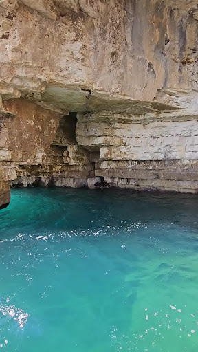 Read moreUn luogo incantevole da raggiungere via mare con il kayak o a nuoto esattamente come la vicina Grotta dei due occhi. Consiglio di visitarla verso mezzogiorno / l'una ovvero quando il sole giunge perfettamente al centro del 'buco', facendo così risplendere i bellissimi colori dell'acqua. Purtroppo anche in questo meraviglioso luogo l'uomo è riuscito a fare danni: agli angoli della grotta è possibile vedere diverse reste (ergo pezzi di retini di cozze, molto pericolosi per gli animali marini). Come se non bastasse l'immondizia, ogni tot arrivano all'interno della grotta diversi barconi carichi di turisti (ovviamente non distanziati tra di loro): questi ultimi sono abbastanza pericolosi sia per i kayak sia per le persone che nuotano e in più, con i loro motori, devastano completamente il fragile habitat marino della costa. Oltre ai barconi (sconsigliatissimi anche dal mero punto di vista turistico in quanto in kayak è possibile sostare quanto si vuole nella spiaggetta) accedono alla grotta senza alcun freno o controllo barche private molto ingombranti e altamente inquinanti e moto d'acqua. Non sarebbe male se la guardia costiera si appostasse nella spiaggetta laterale della grotta multando così tutti questi pericolosi maleducati. NON è vero quindi che la grotta è visitabile solo in barca, munitevi di kayak! Sono molto più divertenti...