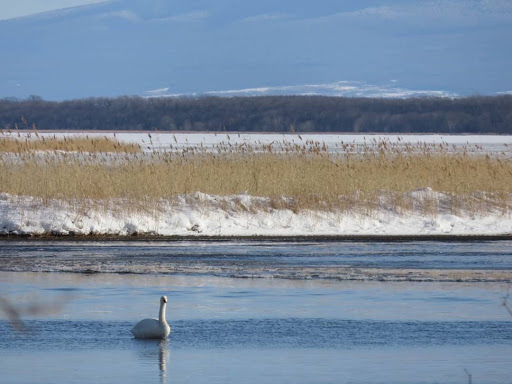 10月からオオハクチョウの飛来地となっていて、雪が降るまでは少なめですが周辺の畑に雪が積もってくると濤沸湖にやってきます。 年末にはオオワシやオジロワシの姿がたくさん見られるようになり、 その他、カモ類もたくさん見られます。
