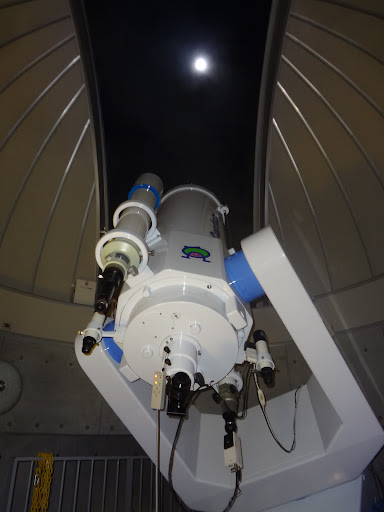 で、夜、実際に星を観測する あたかも戦艦の大砲のような 約1000万円の 40センチ反射望遠鏡の見学! 実際にドームの開閉、回転まで見せて頂きました。