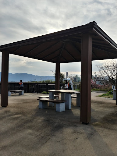公園の入口にはトイレと展望台があります 少し先に駐車場も数台分あります その先にも屋根付きの展望施設があり、石碑や看板があります ネコもいました