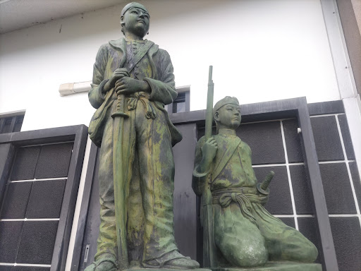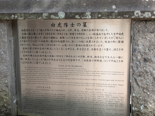 The tomb in front was and is the final resting spot of the 19 members of the 2nd Byakkotai Brigade who took their own lives here at Iimoriyama, on October 8th , 1868. Though the forces of the Meiji government forbade people from burying the bodies of these fallen soldiers, local villagers secretly transported their remains to Myokokuji Temple, where they were temporarily buried. They were later reburied at this spot. It has been renewed twice, and currently stands as it was rebuilt in 1890. The tomb on the right as built in 1900, and contains the remains of those who died nearby ( 31 soldiers ; 3 from the upper rank, 22 from the middle rank, and 6 from the lowest rank ) . The tomb on the left was built in memory of the 62 young 14 to 17 year old samurai who fought and died alongside grown men in Kyoto, Niigata, and Tochigi, in territories where there were no Byakkotai units in place. The monument was built in 2001, for the " Comrades of the...