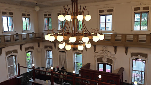 這個以赤煉瓦為外觀主體的鄉土館內外的風格差異很大,特別是挑高的大廳Lobby 設計,古典造型的線板搭配文藝復興風格雕飾的天花板相當吸睛。