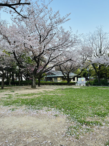 人形浄瑠璃、「曽根崎心中」の近松門左衛門記念館の併設される公園。一寸した池泉回遊式庭園ぽい仕立てに成っている。専用パーキングは無いが、付近にコインパーキングは何ヵ所か在ります。トイレや、自販機はあります。