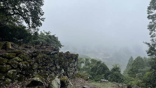 先去取得印章,再按照對應人員給的路線,從末廣神社後方的小徑開始步行攻城。神社附近有一些石垣,但沒有立牌說明,不曉得是否算是城跡的一部分。一開始的小徑走得算舒服,遠方還能看到奇妙的山頭景觀。不過接下來抬頭就是看不見底的斜坡向上,斜坡結束後...