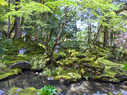 Read more穴水にある真宗のお寺。以仁王を守護してその忠義、振る舞いに平家方をも感服させた武士で、穴水に配流された長谷部信連ゆかりのお寺とも。ここの県指定名勝のお庭はまた実に美しい。現在の形となったのは江戸後期とのことだが、百余年の星霜に苔むしては十分に神さびており、庭自体に既に意思がある。なので濡縁に端座してはこの庭と目をあわせ、その光そそぐ百年の春の美しさをともに喜ぶのである。 面白いのは客殿から一段上の観音堂へと回廊を設けて、この庭を上からも俯瞰的に見られるようにしつらえてあることである。確かに客殿からでは見えない中島の向こうの有様などが見え、実に興。ただ、回廊の傾斜はえぐいものがあり、気を抜くと本当に下まで滑り落ちる。