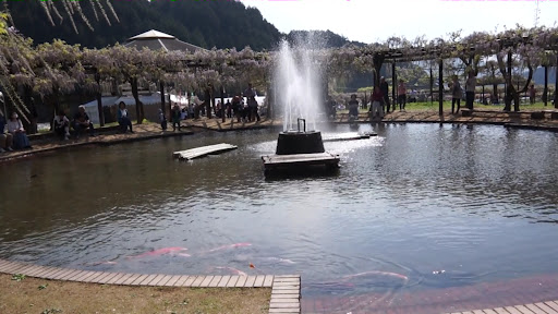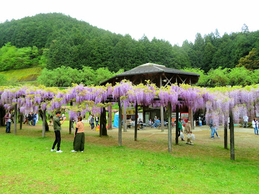 Read more5月1日、G.W.中の平日に行きました。 経由地を一つ挟んだので午前10:30くらいに到着。 渋滞に約30分くらい並びましたが、少しづつ進むのでそれほど苦にはなりませんでした。 駐車場の斜面3,000㎡ に植えられた薄いピンクの平戸ツツジが満開でした。 入り口受付も藤で覆われていて良い香りで迎えてくれます。 入園料¥500.- を支払い公園に入るとすぐ、満開の藤が目の前いっぱいに何重にも広がっていて、陽光を浴びて風に揺れていました。本当に美しかったです。 藤棚は公園の中央にある円形の噴水広場を囲むように回廊になっていて、カメラで熱心に撮影をする方、三脚を立ててビデオ撮影をしている方、スマホで自撮りを楽しむ方e.t.c....