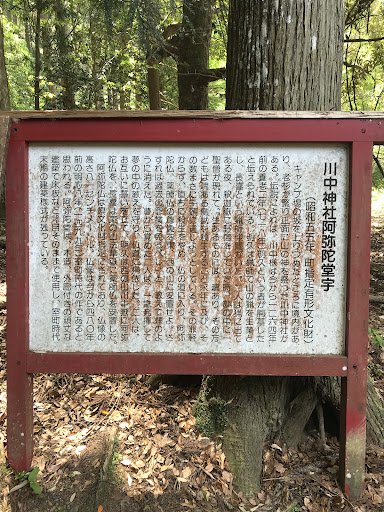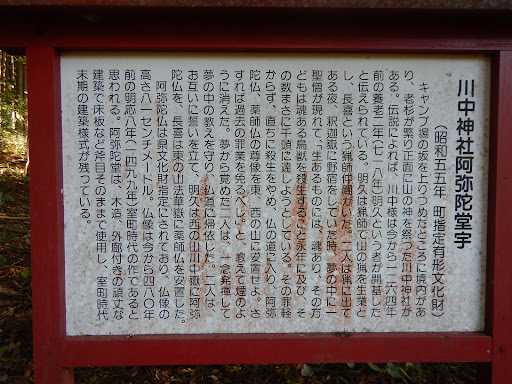 Read more川中キャンプ場の奥(坂を徒歩で20分ほど上りつめた所)に境内があります。