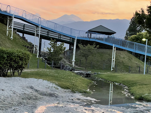 Read more常念岳がきれいに見渡せて、とても気持ちの良い公園です。 公園の中央に川が流れています。 とても珍しいと思いますが、砂場の中を川が流れている感じのところもあり、子どもが大好きな「砂場に水」を思う存分楽しめる場所だと思います。 しかし、洗濯物が怖くて、私はまだその川と砂で遊ばせる勇気がありません、、、 遊具はローラー滑り台のみですが、普通の滑り台ではなく、岩を登ったり、階段を登ったり、山に登る感じが楽しめるので、子どもは何度も何度も滑っては登り、の無限ループをしています。 滑り台のローラーもうさぎや模様が書かれていて、可愛いです。 夏は木陰があまりな...