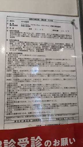 Read more2024.2.19 駅チカの温泉で、支払いは番台形式。当日は3軒 をはしご入浴したのだが、番台に人がいたのはここだけだった。地域の方以外も入浴する方が多いのだろう、先客が4人いらした。 浴室は2x4メートル位の湯船が1つで、長方形の角を丸くした形だ。また湯船と浴槽の床には5センチ角のタイル張り。 温泉は51℃のナトリウム・マグネシウム・カルシウムー炭酸水素塩温泉で無色透明。析出物が浴槽上面にありカルシウムが固まっているようだ。高温のため加水して利用されていた。店の方が熱いから水のそばで入りな、と教えてくれたが44℃はなさそうで、ちょっと熱いかなという感じ。pH8.0なのでツルツル感があるかと思ったが、特に感じられない。多量に加水してるとは思えないので、...