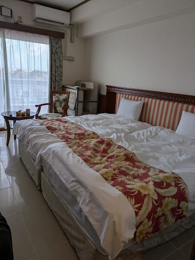 Read moreThe Hotel is well kept and the rooms are clean, neat, and tidy, well appointed and comfortable & is surrounded by many scuba diving businesses. Has to be the best location in Chatan-cho.The view from the Hotel is best seen from the buffet-dining room on the top floor, where there is even an open spa for you to lay back and enjoy the view across the roof tops, and the bays. Breakfast is very generous and is buffet style, and is Japanese or/& Western – and has to be the best value and the best miso soup ever - all for a mere 1000 Yen. Free of charge from the reception is a small router for wi-fi in your room – very effective : be aware though the cleaners will only clean if you hand in your one and only key to the front reception - and they will replace only what you have used. This was not a major problem, because down below, cheap food and drinks of every kind are available everywhere around the immediate premises and foreshore. The front doors are locked after 11pm, but there is a back entrance/exit that is...