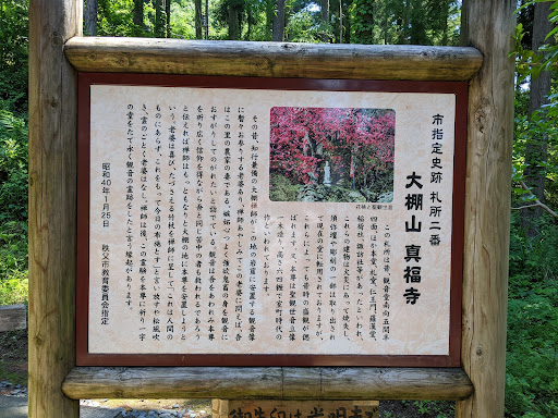 真福寺(しんぷくじ)は埼玉県秩父市にある曹洞宗の寺、山号は大棚山と号する。秩父三十四箇所の第二番札所であり、また、秩父市の史跡に指定されている。なお、1860年(万延元年)の火事で大伽藍を焼失したため現在は高台に観音堂が建つだけの無住の寺で、納経や御朱印などは麓の光明寺で行っている。との事です。