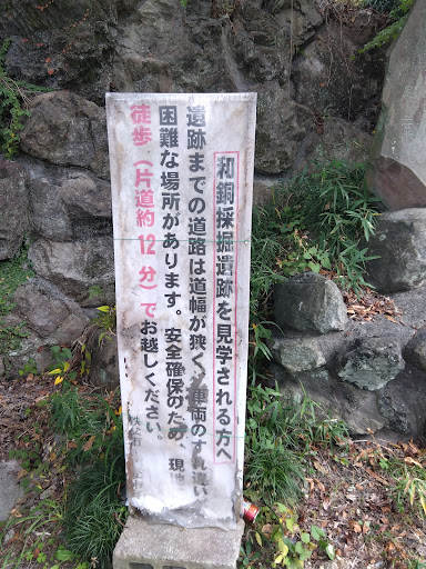 遺跡には銅を採掘した、硬い岩山をえぐった竪堀状の2条の溝が山肌に残されています。銅の種類としては精錬や加工が必要な銅鉱石ではなく、純銅に近い「にきあかがね」が採れたそうです。そして遺跡の前には、当時銅の選別にも用いたであろう小川が流れていました。
