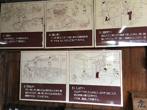クモの巣はっていそうな古さ、テープ?っぽい古い音源流しっぱなしの説明音声、数部屋の展示です。期待しすぎは禁物ですが、昔の酒づくりの道具、流れの展示を間近で見ることができる。大きな酒樽をはしごを上って覗いたり触れたりできるし、 すいていたので数部屋ある展示を自由に見学できて、(古い公民館の歴史展示(一部屋)ぐらいを思っていたのですが)想像よりよかったです。