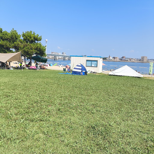 A nice, small beach with a closed off swing area, barbecue rentals, toilets, and volleyball nets. The swimming area offers calm waters good for kids to play in. The water wasn't too clear and had a lot of seaweed. The barbecue rentals include a table for four people, charcoal, and a small barbecue grill for ¥5000. There are toilets and changing area with a fresh water spout for washing feet. There is a nice sandy beach and a walking path and a grassy field...