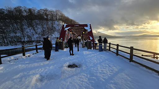 The bridge’s vibrant red color contrasts beautifully with the peaceful backdrop of Lake Shikotsu, offering picturesque views throughout the year. During warmer months, the surrounding greenery enhances its striking appearance, while in winter, the snow-covered landscape creates a serene and romantic atmosphere. At night, the bridge is illuminated, casting a magical glow over the area.