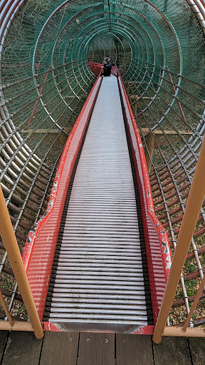 This is a really big slide! My husband and I went down it ourselves and it was a lot of fun. There is a small wooden play structure at the bottom. There is a swing rope there as well. You can see the top of the slide from the bottom so it's a great place so you can watch your kids from the bottom and see them all the way up and down th slide. There is also a shrine right at the top that was nice to walk...