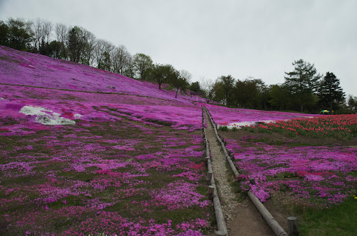 ○ 芝さくら公園 2枚画像添付 開花 : 5月中旬 ー 6月上旬 苗が新しいので鮮やかな色です。 風に乗って よい香りがーー。 対面のコスモス園側シバザクラ も綺麗に見えます。逆光時は色が濃いような?