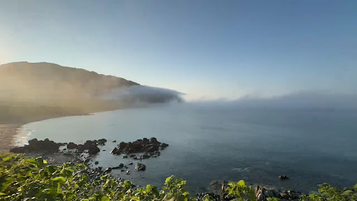 真下を通り過ぎると岬の先端から海へ向かって霧状になった水分がどんどん流れ込んでいく 気温の上昇とともに海から森へと吹き上げられた水分が夕暮れともに海へと還っていく 地球の大気のリズムを感じられる現象を実際に見ることが出来て感動する