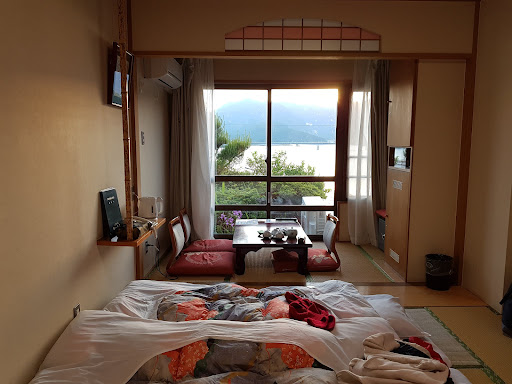 Pros Hotel is near to the station; about 15min walk. You can even shop/ sight see along the way as there are plenty of souvenir shops and restaurants. Optionally, contact the Hotel for shuttle van when you arrived at Kawaguchiko station (take note of the time they offer the bus). Private/ own shower and toilet attached to the room Beautiful view overlooking the lake from our room Very comfortable futon Green tea and snacks ready in the room; complete with yukata 2 different outdoor (rotenburo) onsen and both are lovely although I personally prefer the one on 1st floor, which is bigger Hotel breakfast is good: option of Western/ Japanese Coin laundry available; inform the front desk for laundry detergent (around ¥200 per load/ wash, and another ¥100-¥200 for dryer if i recall correctly)