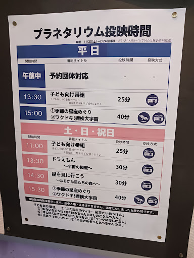 Read moreお得感あります! 大人と幼児で490円、遊び場はそんなになくて一時間ほどしか遊べないかと思いますが、プラネタリウムがすごい! 毎月のようにプログラムの変更があり、今まで行った中で普通の真面目なプラネタリウム以外に妖怪ウォッチ、ポケモン、ドラえもんのプラネタリウムがありました。 どれも30分ほどの時間で子供多めなので、多少うるさいですが子連れにはとてもおすすめです。 土日だと数時間おきにプラネタリウムがあるので、科学館でプラネタリウム→動物園→プラネタリウム→ランチ→プラネタリウムみたいな感じで好きな子は延々と見ていられます。 再入場も可能なので大人しく30分プラネタリウムが見られる...