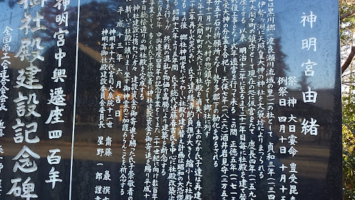Read moreこちら、高津戸渓とワンセットですねぇ。 昔から、地元住民のみなさんの信仰をいただいていることがよくわかります。実際、境内から縄文・弥生の土器が数多く出土しているとのことです。 さらにこの周囲には、古代から谷地を利用した田畑があるようです。 ひとが、本当にいにしえより住んでいたということですね。 開基は承和3年、1347年、伊勢神宮ゆえんの神社さんのようです。 遷宮は21年に一度していたとのこと 本殿のご神号の額「皇大神宮」、揮ごうは、彼の篤姫の養父、近衛忠煕によるものということです。 ほか、かつて寄進された宝塔などは、天明の元号が見てとれます。 境内の一部に、歴代宮司のご墓所があります。綿々と信仰の紐がつながれてきたことの、一つの証左ですかね。 お詣りの後は、本殿から左手に向かい、ぜひとも高津戸峡へ足を運ばれることをおススメ。 涼やかな霊気に包まれて、住民の方がこの地で、神仏のどんな声を聴いたのか、なんとなく...