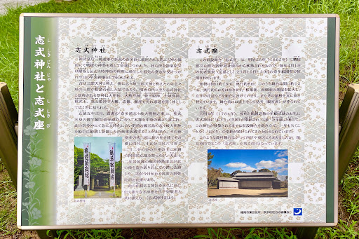 志式座(ししきざ) この常設舞台(ぶたい)「志式座」は、明治28年 (1895)に糟屋(かすや)郡久山町の猪野神社境内(いのじんじゃけいだい)から移 築されたもので、毎年4月1日の初老賀祭(しょろうがさい)(厄(やく)落とし)と7月19日・20日の奈多祇園(ぎおん)祭で使用されています。 建物は間口(まぐち)約18m、奥行約8m、このうち舞台は間口約12m、奥行約5mをはかります。移築後、両側面の 楽屋を拡大し、左手の花道などを新たに設けています。また茅(かや)の屋根を瓦(かわら)に葺(ふ)き替えています。舞台前には 盛土をして見所(観客席)が作られています。 天明4年(1784年)、疫病(えきびょう)と飢饉(ききん)退散の祈願成就(きがんじょうじゅ)のお礼に志式神社に「おどり」(芝居)が奉納され、以後 「万年願(まんねんがん)」と称(しょう)して、この舞台が移築されるまでは仮設舞台を組み立て、一年も欠くことなく「おどり」の 奉納が続けられてきたと伝えられています。 このような農村舞台はかつて西区や東区にもありましたが、現在市内ではこの「志式座」が残るだけとなっ...