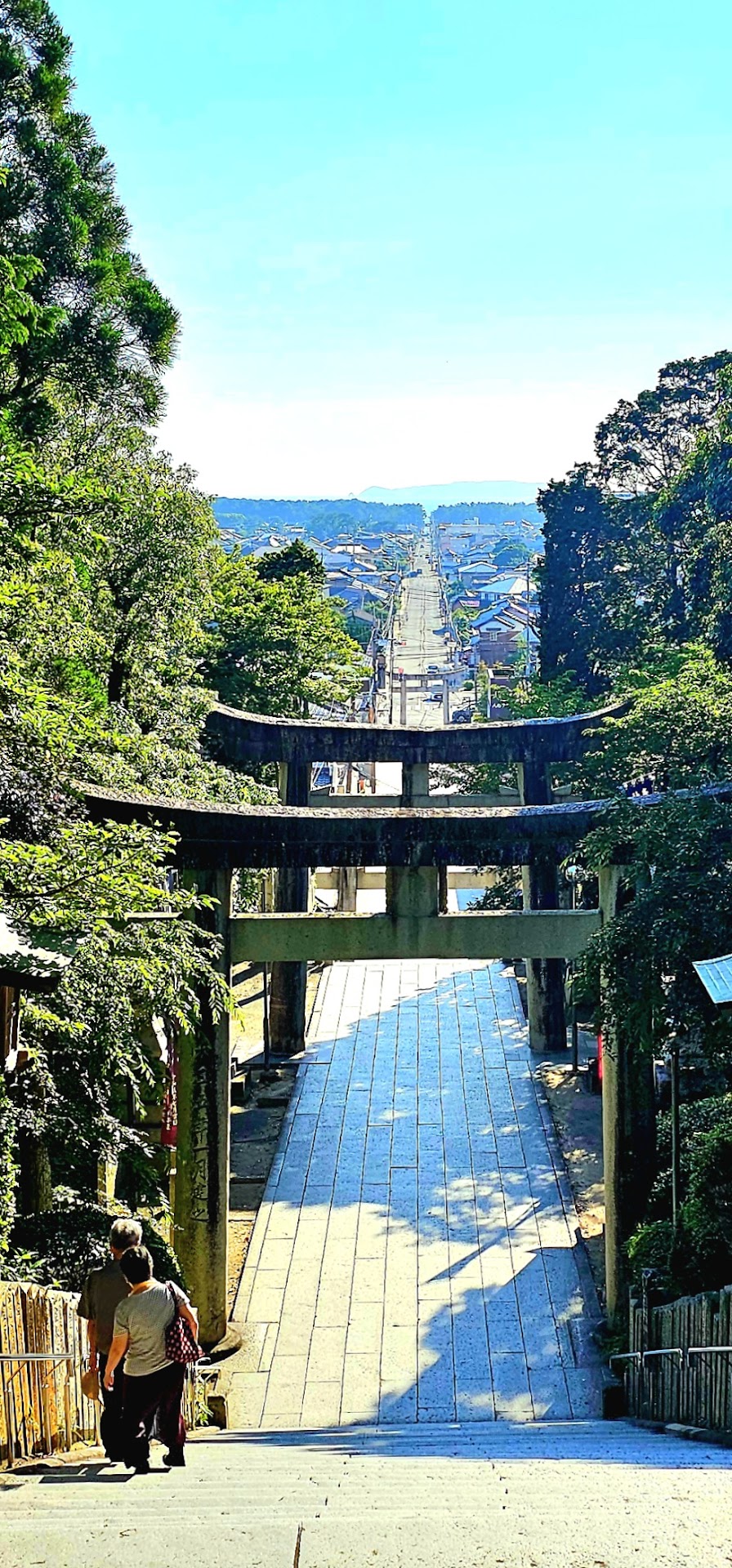 😬🎏😍 เมื่อมาถึงที่แล้วไม่รีบไม่ร้อน เราเลยนั่งพักรับลมเย็นๆ มองเส้นขอบฟ้าจากวัดนี้ ผ่านถนนที่ทอดยาวเป็นเส้นตรงไปถึงชายหาดมิยาจิฮามะ⛩️🌆🏞🌅 บรรยากาศดีมาก งดงาม น่าจดจำ 🏄♀️🏄