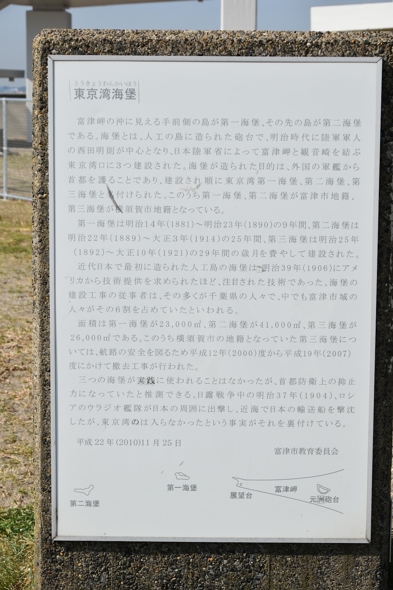 富津岬の沖に見える手前側の島が第一海堡、 その先の島が第二海堡 である。 海堡とは、人工の島に造られた砲台で、明治時代に陸軍軍人 の西田明則が中心となり、 日本陸軍省によって富津岬と観音崎を結ぶ 東京湾口に3つ建設された。 海堡が造られた目的は、 外国の軍艦から 首都を護ることであり、 建設され順に東京湾第一海堡、第二海堡、第 三海堡と名付けられた。このうち第一海堡、第二海堡が富津市地籍、 第三海堡が横須賀市地籍となっている。