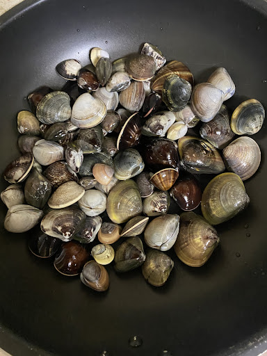 海岸に入ってみると貝がゴロゴロ取れます。が、アサリではありません。分厚いです。詳しくは知りませんがこういう分厚い貝は砂抜きとか手間がかかるとか(よく知りません)。なので知ってる皆さんは取らずに捨てるので辺りはその貝でいっぱいでした。結局アサリはほぼなし、ハマグリっぽいのが少し取れました。