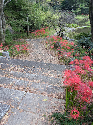 Read more素敵なお寺で、池や庭もよかったです。丁度、彼岸花が咲いていて満開かな?、まだつぼみの花や枯れかけの花もありました。白い彼岸花も交じり、夕方にはちょうど光が差し込んでいました。色んなところに彼岸花がありました。 お寺の中は、大きなヒノキがありとても迫力ありますし風格があります。また門までの道もすごく素敵でした。またお寺の壁も風情があり、お寺内の庭もきれいに整備されておりよかったです。基本、石...