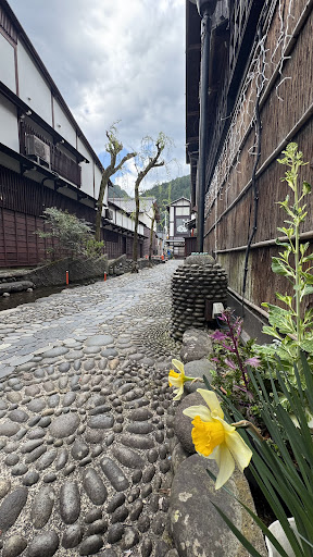 After feeding the giant koi at Igawa Lane, we continued strolling to Yanaka Lane on 16 April around 2:15 PM. This peaceful stone-paved path truly captured the essence of Gujō Hachiman as a “Water City”—with canals running beside traditional wooden homes and beautiful koi fish swimming right along the roadside.