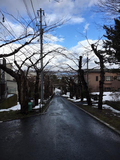 道路に面した第1鳥居をくぐると、なだらかな上りの坂道がず~~~っと続きます。 シーズンは過ぎてしまいましたが参道沿いにはソメイヨシノが植えられていて桜のトンネルのように美しいと思いました。