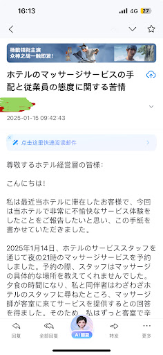 As soon as we left, we wrote a detailed and well-formatted complaint email and translated it into Japanese using an online translation tool. It has been four days since then, and we haven't received any response. (We had previously communicated with the hotel via email about dining issues and they usually replied within half a day, so they definitely saw it.)