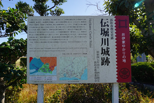 Read more伝堀川城址 の看板 永禄11年(1568) 徳川家康は、 遠江侵攻にあたって、 井伊家の被官であった井伊谷三人衆、近藤康用、菅沼忠久、鈴木重時らを調略し、彼らの本領を安堵しました。これにより、家康は井伊谷から刑部(おさかべ)城 引間(ひくま)城へと軍を進め、遠江に前線を得ました。 しかし、今川配下の土豪と農民たちは堀川城に立て籠もって抵抗しました。翌、永禄12年(1569) 徳川家康の遠江侵攻にも、もっとも強く抵抗した城跡です。 当時の浜名湖の湖岸にあって、水辺の守りを固めた砦だったと思われます。形や場所ははっきりしません。 ここで家康は籠城兵を「撫で切り」とし、敗残兵を探し出して気賀の獄門畷にさらし首にしています。 城兵は全滅となりましたが、一部が対岸の堀江城に渡り、落城の情報を伝え、堀江城は家康との和睦を選択します。 同じ今川家に仕えた 遠江の諸将には、それぞれにとって大きな選択の年となりました。 なお、 井伊谷三人衆は家康の命で後に井伊直政につきますが、やがてそれぞれ独立していきま した。 About 450 years ago, Tokugawa Ieyasu had attacked this castle. And he completely destroyed vassals of Imagawa Ujizane in this...
