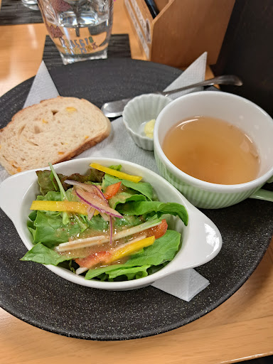 そして、併設のカフェに始めて入りましたが、パスタやドリア、カレーのセットにスープ、サラダ、ミニパン、ドリンクがついて980円は安い💴✨👛し、何よりどれも材料が良いのか、優しい味で美味しかったです~💕さらに、テイクアウトでは300円のケーキやプリンが食事に付けると150円で😍友達はリンゴのタルト、私はカボチャ🎃プリンを頼みました❗これも、メッチャ美味しかったです😋
