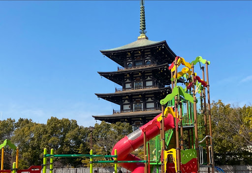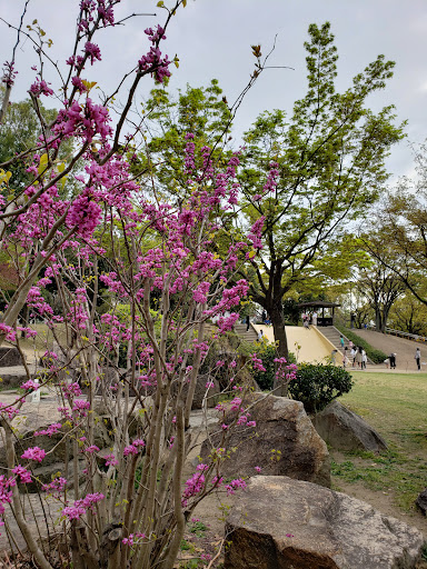 Read more土曜日、円満寺へ家族でお参りに行った帰りに寄ってみました。ちょっと驚きました。 桜の季節と重なったこともありますが、こんなに大きくて素敵な公園だったとは…! 小さな子供たちから~ご年配まで楽しめると思います。 遊具も充分☆ 幅がひろーい滑り台‥ここはかなり大きい子供たちも楽しそう♡ 桜の木の下では、自立型のハンモックで本を読んでいる人もいます。 芝の広場のまわりには、なんとも絵になる木立。 周りに配置された岩は、座ったり少し登ってみたり‥お弁当を持ってきてこの辺りで食べるのも良さそう。 お抹茶が戴ける建屋もありましたが 残念ながらこの日は終了。