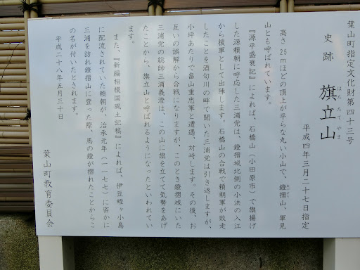25mの高さですので、10分程で登れてしまいますが、この地を治めた三浦氏との縁の深い場所であり、「旗立山」、「鐙摺山」、「軍見山」と3つの地名をあります。 まず、「旗立山」の謂れは、石橋山の合戦に敗れた源頼朝公を救うための軍勢が戦いに間に合わず、軍勢を引き返す帰路に、当時は平家側であった畠山重忠の軍勢と小競り合いとなり、後に三浦一族の隆盛を導いた三浦大介義澄がこの山に旗を立てて気勢を上げ軍勢を鼓舞したという伝説から旗立山とも呼ばれています。 次に、「鐙摺山」は、挙兵前の源頼朝が、鐙摺にあった太多和三郎義久(三浦大介義明)の別館を訪れた際、頼朝公がこの山に登る際に、頼朝公の鐙が摺れたことから、頼朝が鐙摺山と名づけたとも伝わっています。また、平家討伐後は、鎌倉を追い出された愛妾、亀の前をこの鐙摺にある大多和義久の屋敷に逃したこともあり、頼朝は度々この鐙摺を訪れたともいいます。なお、頼朝公の最初の妻であった八重姫の父親である伊東祐親公がこの鐙摺山で斬首されたと伝わっており、その伊東祐親公の供養塔もあります。三浦家と源頼朝公の深い繋がりが分かる場所でもあります。 最後は、別名「軍見山」とも呼ばれます。源頼朝公と深い信頼関係を築いていた三浦氏(三浦大介義明・三浦義澄)ですが、最期は宝治合戦で北条氏に滅ぼされてしまいます。その後は、傍流の相模三浦氏による再興されますが、最期には、伊勢新九郎率いる後北条氏に攻めらて滅ぼされてしまいます。 その戦いの中、小坪の住吉城(住吉城址)から退却する三浦道寸がこの山に登って敵を偵察したことに因む地名と伝わっています。 初期、隆盛、最期と三浦氏の歴史に因む3つの名前が、この小さな山にあると思う...
