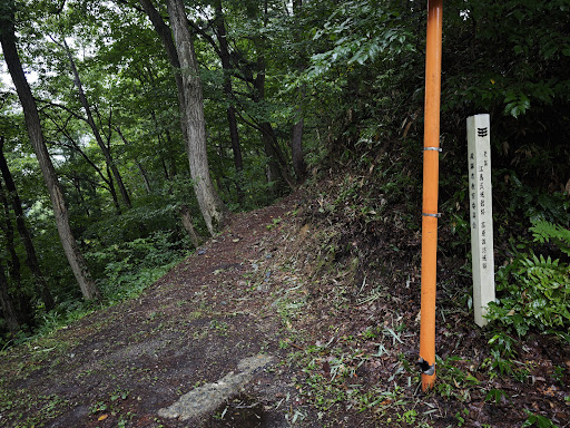 Read more麓の江馬氏居館にてガイドの方から教えてもらい、江馬氏のおそらくはメインの戦時の詰め城である当城にやってきた。 Googleマップにナビを委ね車で登り口まで上がると、近くの道路離合スペースに短時間停めさせていただき、高原諏訪城跡主郭までは比較的狭い山道を10分強歩く。途中堀切や竪堀跡を見ながら主郭に到着すると、上はシダ類が繁茂する中、江馬氏城郭跡の石碑。 眺めが良く、神岡の街が一望できる。またこの街が河岸段丘であることがよくわかる。