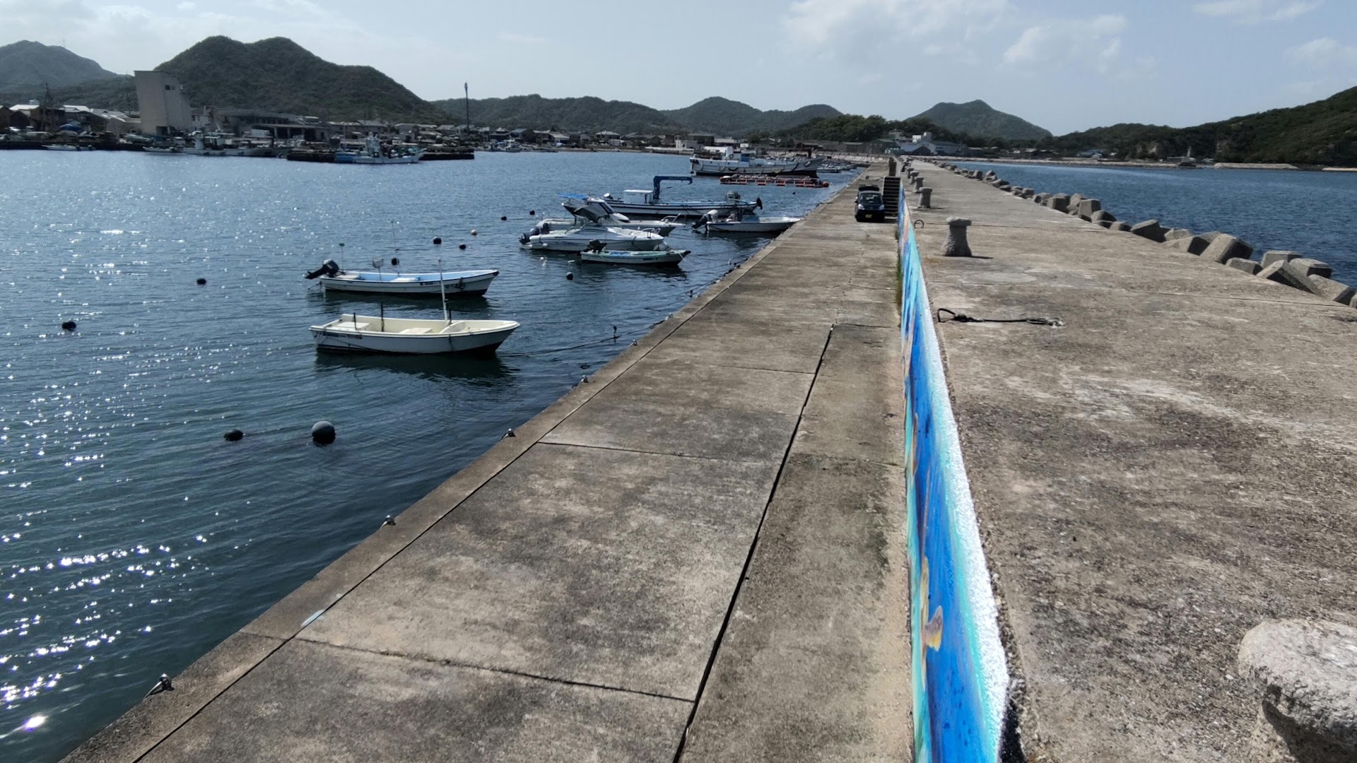 漁船が停泊している漁港の西側の端に壁面アートの入口があります。ゲートのあるほうを入って行くと壁面(防波堤)の上を走れます。下の道を防波堤沿いに入って行くと壁面アートの前を走れます。