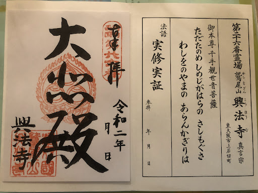 Read more【興法寺】(こうほうじ)は、役行者が開基し、弘法大師空海が諸堂を整備したと伝説される寺院です。 伝説では、千手寺を開いて神並村(こうなみむら)にあった役行者は、生駒山の東に吉祥を表す雲がたなびくのを見て、氷室滝(ひむろのたき)という滝にちかづいてみると、そこに氷室権現という神があらわれて、「大聖歓喜天(だいしょうかんぎてん)」いわゆる「聖天(しょうてん)」像を授けられたといいます。平安初期は弘仁六年(815)、弘法大師空海がこの地に参籠のおり、九頭龍(くずりゅう)権現が出現して、役行者が授けられた聖天像を授けます。そこで弘法大師は、この地に諸堂を建立し、鎮護国家の道場としたと伝えられています。しかし、南北朝時代は正平三年(1348)に起こった四条畷合戦によって諸堂消失。永禄六年(1363)に大西丹後守浄味が再興し、参道に桜を植えたといいます。 【興法寺】が本尊としているのは、元正天皇の代、行基菩薩が勅をうけて造立したという伝承される千手観音です。しかし、実際は平安後期の作で、大阪府指定文化財とされています。また、聖天は境内に入ってすぐ右にある聖天堂に祀られています。境内の左には護摩堂があり、本尊は烏枢沙摩(うすさま)明王で、左右に不動明王と役行者を奉祀しています。烏枢沙摩明王は、不浄を消し去る明王とされ、寺院ではしばしばトイレに祀られる明王です。興法寺の烏枢沙摩明王は、他の寺院ではあまり拝することの出来ない、大変大きな姿をしています。