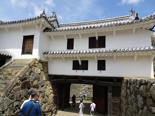 The Nu-no-Mon (Nu Gatte) is the only three-floored yagura-mon gate (a gate with a tower set on top) in the castle. It occupies an important place that acts as a barrier to the series of terraced baileys that link to the slopes of Himeyama. All wooden parts of the doors of this solid gate are clad in black iron attached with large dome-headed tacks. The second floor of the guard tower contains hidden stone drops that allow defenders to drop stones onto enemy soldiers directly below the gate, and make it possible to observe and fire at all those who enter the gate. A high stone wall with a fan-shaped curve juts out in front of the gate, creating an L-shaped path that provides improved defensive capabilities. The path that leads from the Nu-no-Mon (Nu Gate) to the keep is known as the lower road, while the path that leads from the Harro-Mon (Ha Gate) through the Ni-no-Mon and Ho-no-Mon (Ni and Ho Gates) to the keep is called the higher road.