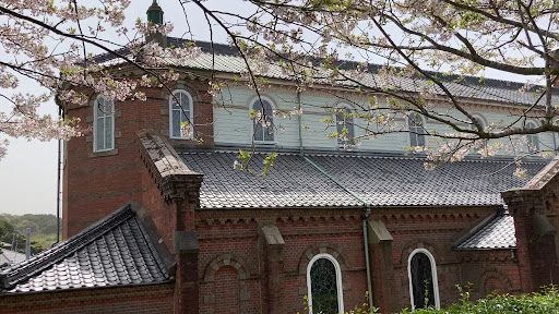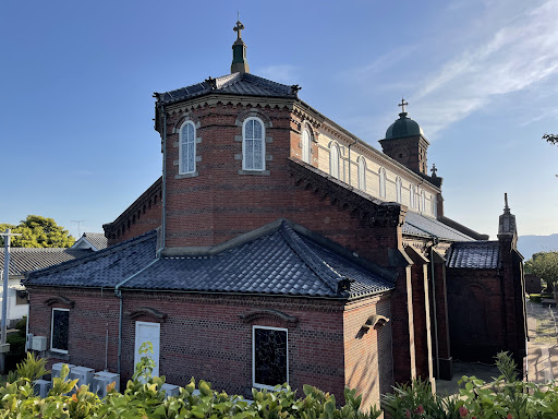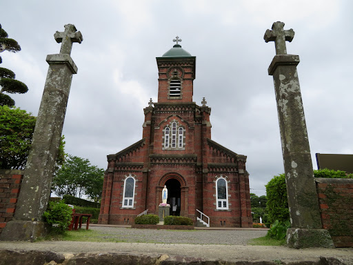 Read more2018.5.9/13:00拝観。 《鉄川与助、名作と言われた最後のレンガ造教会堂》 教会建築の第一人者、鉄川与助の最後のレンガ造教会です。 1層は玄関部、2層に3連アーチの縦長窓、3層が鉄川与助独特の十字架をいただく八角ドームを乗せた鐘塔で、名作と評されてる建築物です。 建てる時に使われた石灰は、信者の方々が集めた貝殻を焼いたそうです。その後が、今も教会前に残っています。