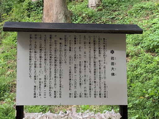 Read more達谷窟毘沙門堂西側の大岩壁に刻まれた磨崖佛像で通称「岩面大佛」と呼ばれています。 前九年後三年の役で亡くなった敵味方の兵の諸霊を供養するため、陸奥守源義家公(通称:八幡太郎義家)が馬上より弓削を以って彫り付けたと伝えられている、高さ約五十五尺、顔の長さ約十二尺、肩幅約三十三尺あり全国で五指に入る大像で「北限の磨崖佛」として有名です。 明治二十九年(1896年)の地震により磨崖佛像の胸から下が崩落してしまい現在も磨崖...