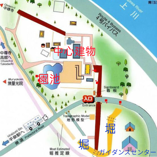 岩手県平泉町にある、奥州藤原氏の拠点跡と考えられている大規模な遺跡で、平泉の中心部、北上川に面した台地に位置し、奥州藤原氏の2代目・基衡から4代目・泰衡が政務を執り行った「平泉館」であった可能性が高いとされています。 この遺跡は、1988年からの発掘調査によって注目され、周囲を土塁と堀で囲まれた広大な敷地から、多数の建物跡や庭園跡、道路、門跡などが発見されました。特に、中央の広場を囲むように配置された大型の建物群や、池を中心とした庭園の遺構は、当時の平泉が政治・文化の中心地であったことを物語っています。