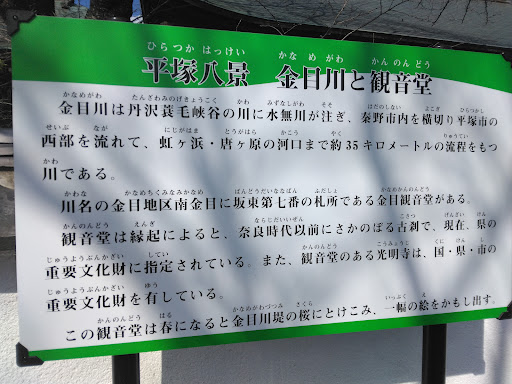 Read more2016/04/05参拝しました。この日は渋田川「鷹匠橋」で満開の桜を見た後、平塚市金目の坂東三十三観音霊場の第七番札所まで足をのばしました。 いつもなら自宅伊勢原から片道1時間位で歩いてお参りしています。 通称「金目観音」と呼ばれている天台宗の寺院で、仁王門前に相模湾に注ぐ金目川が流れています。昔は、上流の小田急線の鉄橋が流された事もある、上流の丹沢水系に一度大雨が降れば、暴れ川となり金目地域まで濁流はながれ狂いましたが、河川の護岸整備や砂防堤が造られてからは、大人しい川になってしまいました。 仁王門には真ん中に赤い「金目観世音」の大きな提灯が架かり、右側に大きなわらじが掛かっています。また金目川の右側手前には石造りの「摩尼車」が取り付けてあります。 山門の正面が本堂で左側に歓喜堂、更に左側に「文殊普賢堂」があり、本堂から右側が大師堂でその右手が庫裏になり御朱印や授与品の取扱いがあります。庫裏の手前本堂側に「水琴窟」があり、心が洗われ...