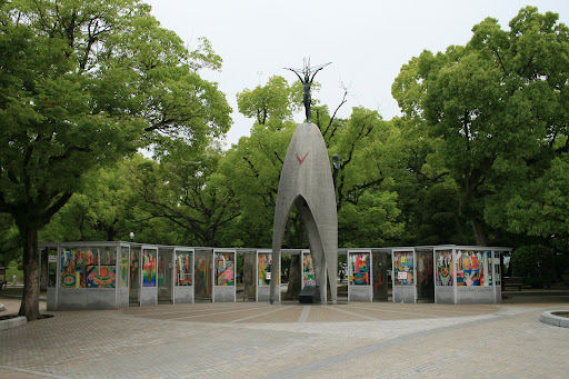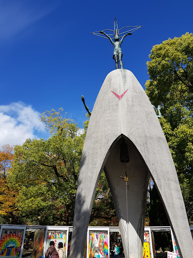 Story of Sadako Sasaki This monument is inspired by Sadako Sasaki, a girl who was 2 years old at the time of the Hiroshima bombing (6 August 1945).Ten years later, she developed leukemia due to radiation exposure. While in hospital, Sadako began folding paper cranes inspired by a Japanese belief that folding 1,000 cranes could make a wish come true. Sadako managed to fold over a thousand cranes before her death in 1955 at the age of 12. Her classmates and friends collected donations nationwide and internationally to build this monument in her memory and for all child victims. The statue is about 9 meters (30 feet) high. At the top stands a bronze statue of a girl (Sadako) holding a golden origami crane above her head, symbolizing hope and peace. On the sides are figures of a boy and a girl representing a bright future and innocence. Around the base are glass cases filled with thousands of colorful paper cranes sent from children and peace groups all over the world every year.